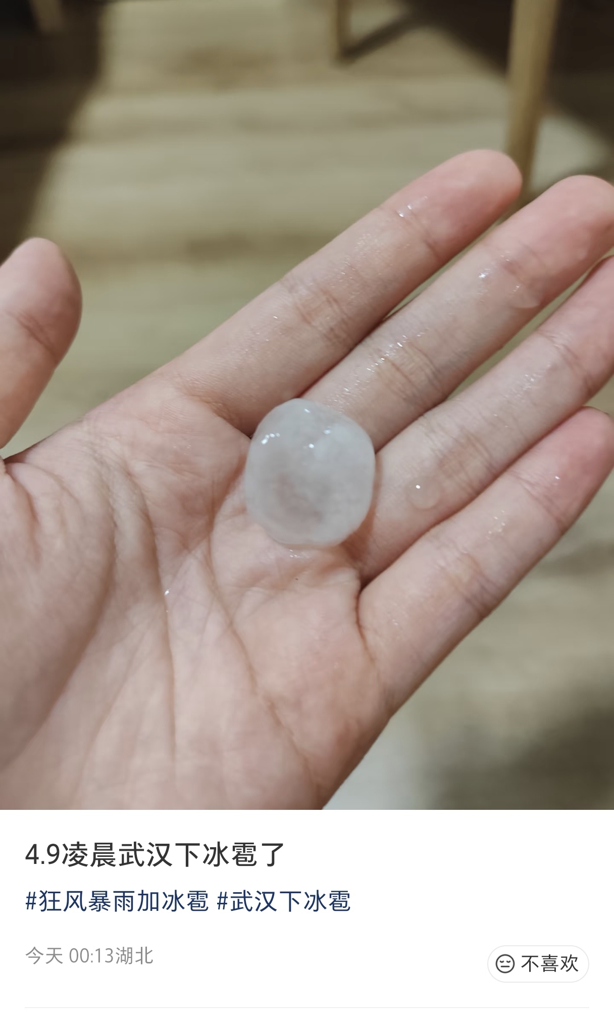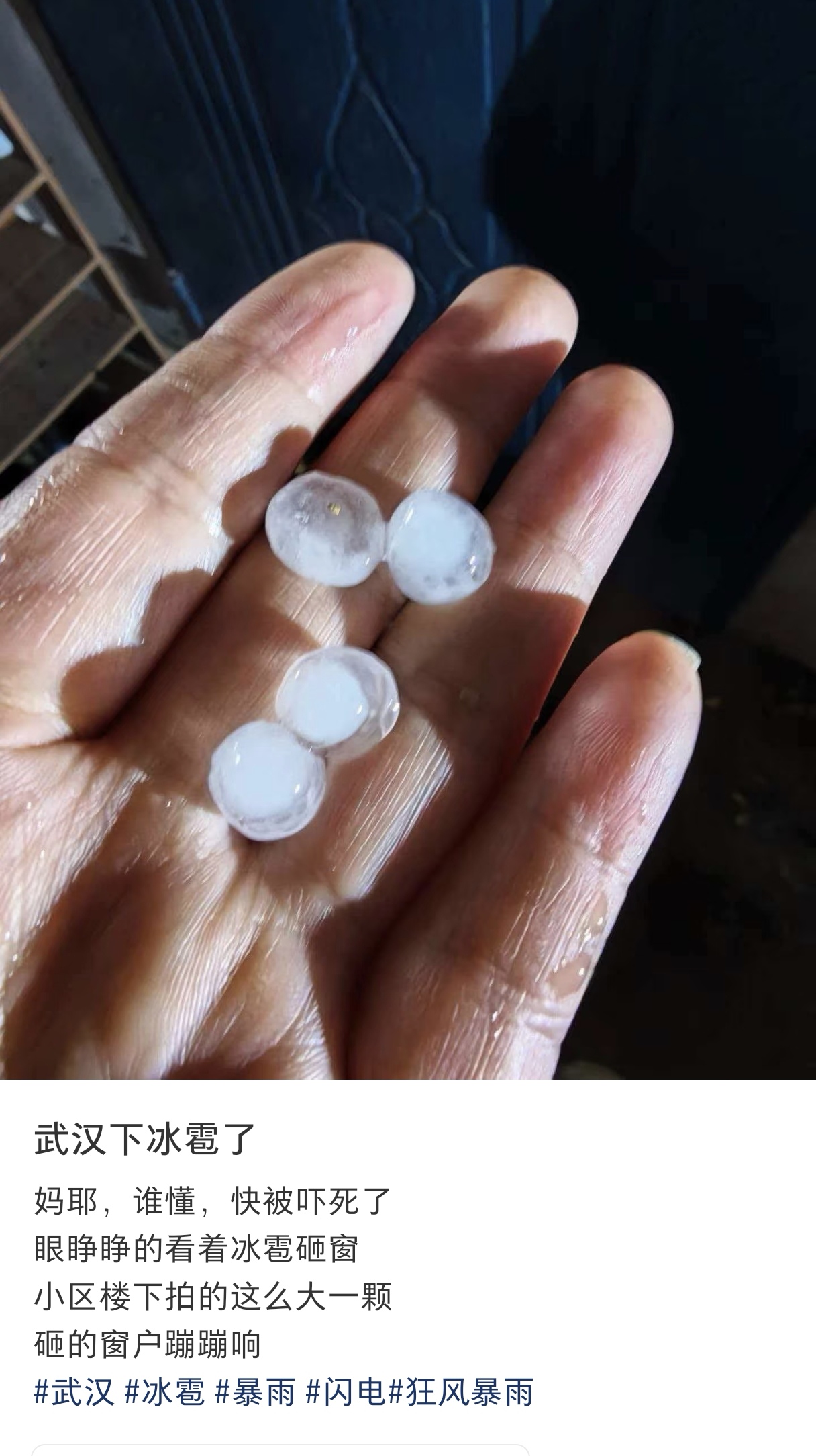 4月9日凌晨0时左右,武汉的东西湖、硚口、黄陂等多个城区遭遇强对流天气,部分地区甚至下起了冰雹。网友们在社交媒体上,纷纷晒起自己拍到的“玻璃弹珠”。