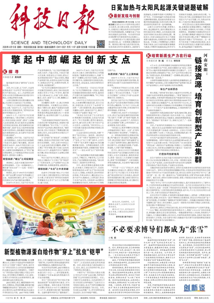 4月13日,《科技日报》头版头条刊发报道《擎起中部崛起创新支点》,具体内容如下。
