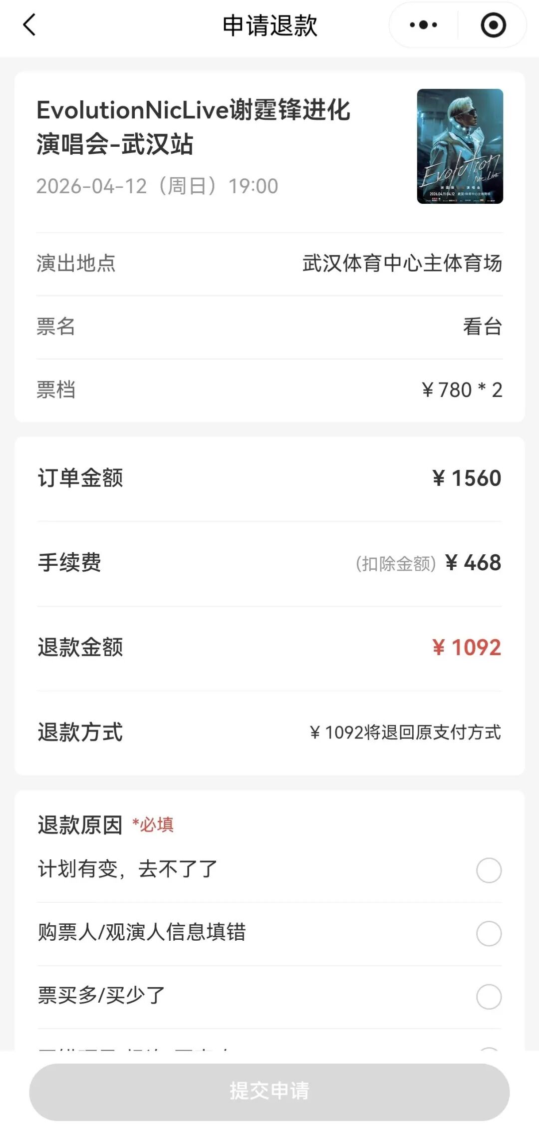3月25日下午3点20分,Evolution Nic Live谢霆锋进化演唱会-武汉站4月12日场次进行第二轮售票。为提高成功率,黄女士与亲友同时在两个主流购票平台操作。最终,两个平台均抢票成功,共支付1560元,每张票780元。她在支付成功后5分钟内联系其中一家平台客服,申请全额退款。