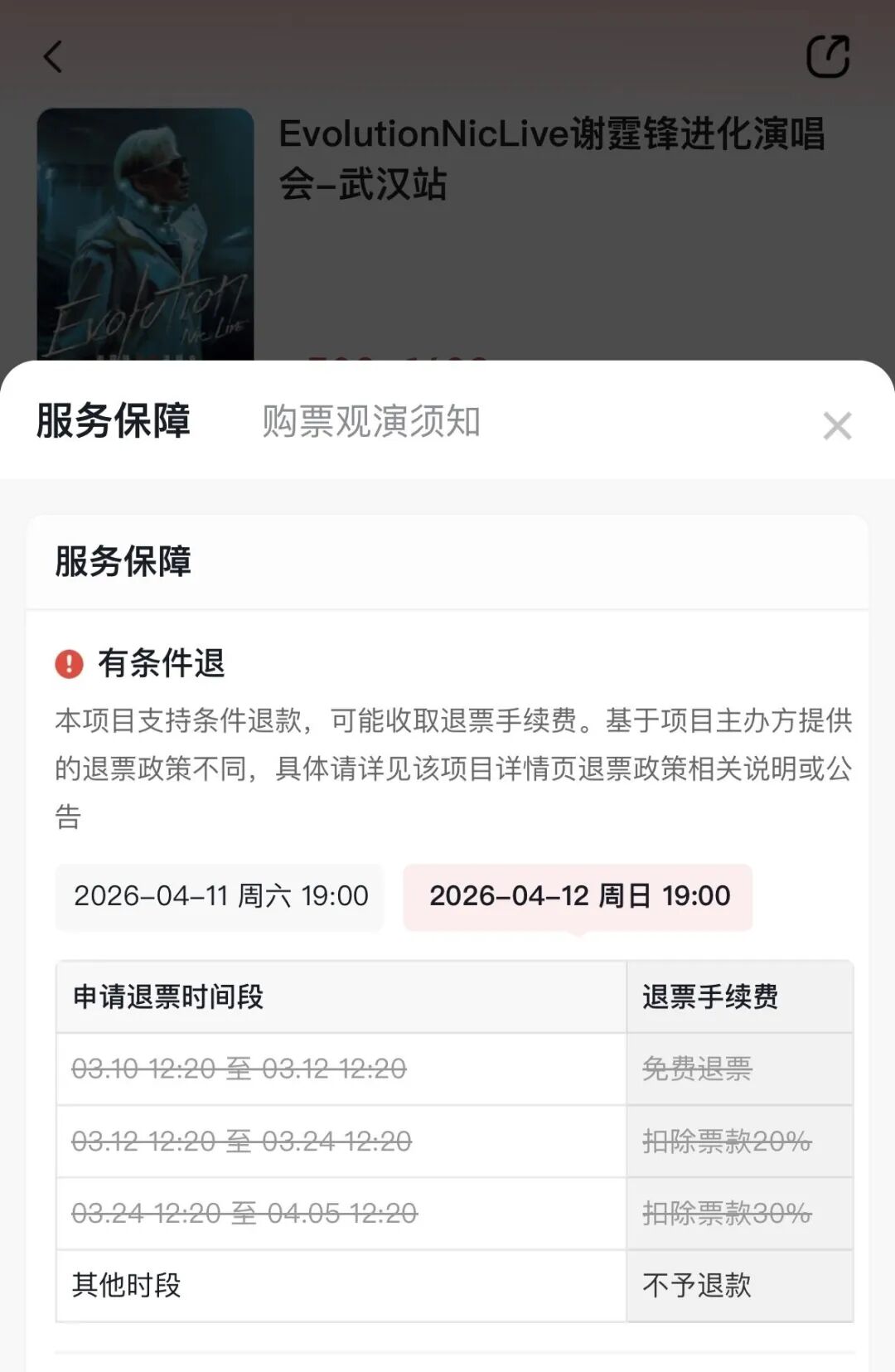 “记者在某购票平台看到,谢霆锋武汉站演唱会观演须知中明确写明:3月10日12:20至3月12日12:20免费退票;3月12日12:20至3月24日12:20扣除票款20%;3月24日12:20至4月5日12:20扣除票款30%;其他时段则不予退款。黄女士于3月25日购票,已处于扣除30%手续费的时段,平台按规则执行。”