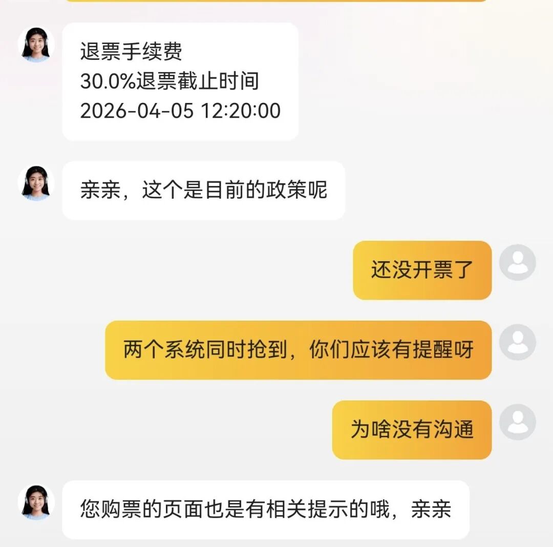 黄女士对此难以接受。她认为,订单尚未出票、不影响二次销售,平台完全具备全额退款条件。她还质疑:“既然实行一证一票,为什么同一张身份证能在两个平台同时下单成功?”由于平台规定4月5日后停止退票,为避免更大损失,黄女士最终自行承担了30%手续费完成退票。