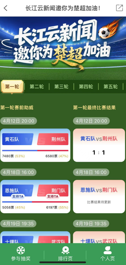 在上周日进行的楚超揭幕战中,黄石队主场1:1战平荆州恒隆队。本周末,你支持谁?长江云新闻“楚超”专区已开设17个市州专属球迷圈(点击进入加油专区),球迷可点赞助威、参与“胜负神预测”抽奖,还有机会赢取红包和球票。