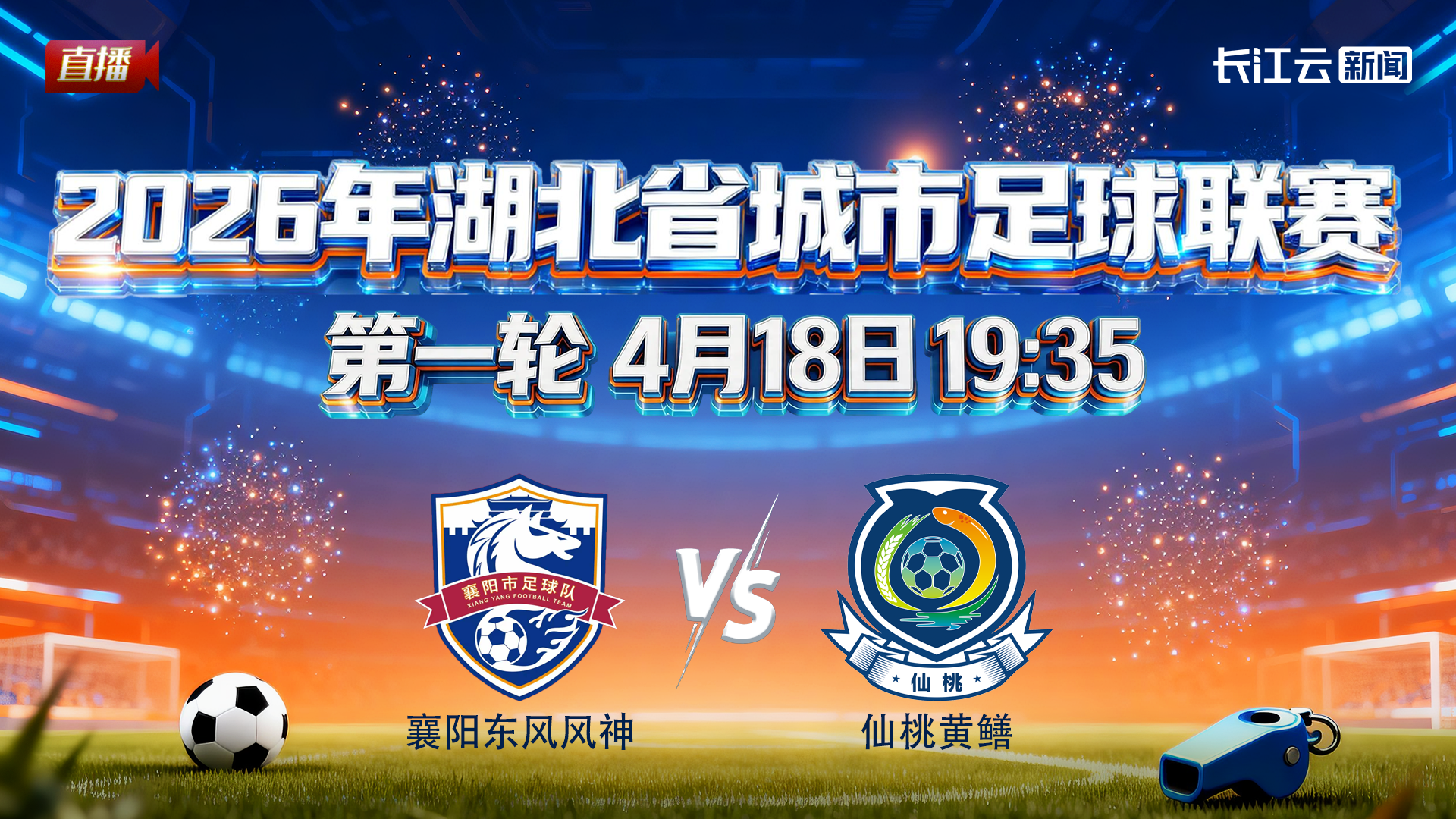 2026年湖北省城市足球联赛(“楚超”)第一轮——襄阳队主场迎战仙桃队的比赛,将于4月18日19:35在襄阳市体育运动中心打响,长江云新闻将全程直播本场对决。