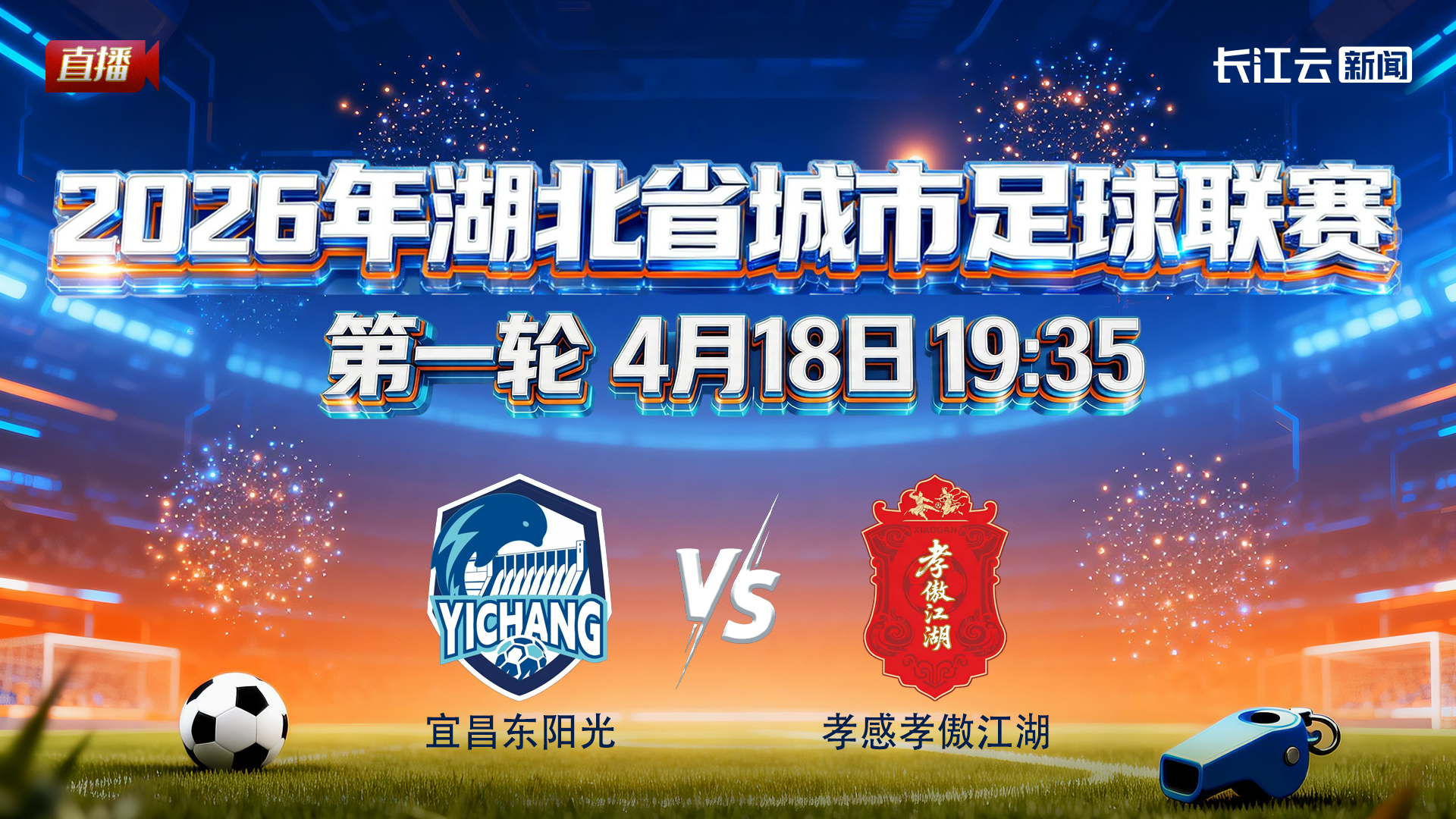 2026年湖北省城市足球联赛(“楚超”)第一轮——宜昌队主场迎战孝感队的比赛,将于4月18日19:35在宜昌市体育场打响,长江云新闻将全程直播本场对决。