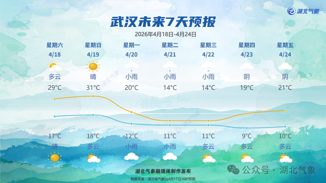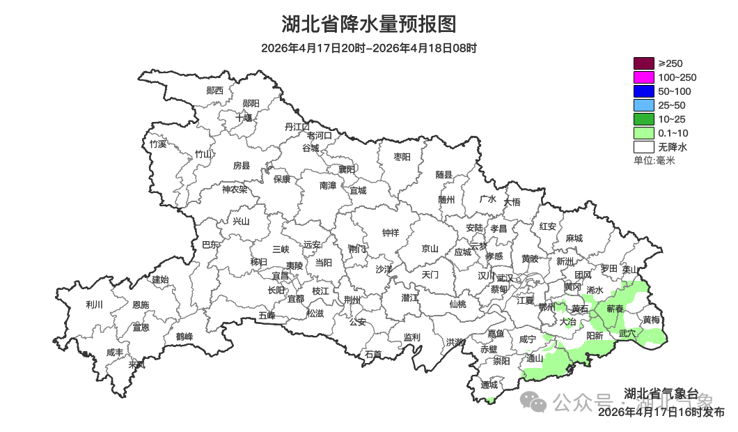 4月17日20时-18日08时,全省多云,其中鄂东南局地有小雨。夜间到早晨省内局地有雾。最低气温西部10~14℃、中东部14~17℃,偏东风2到3级。