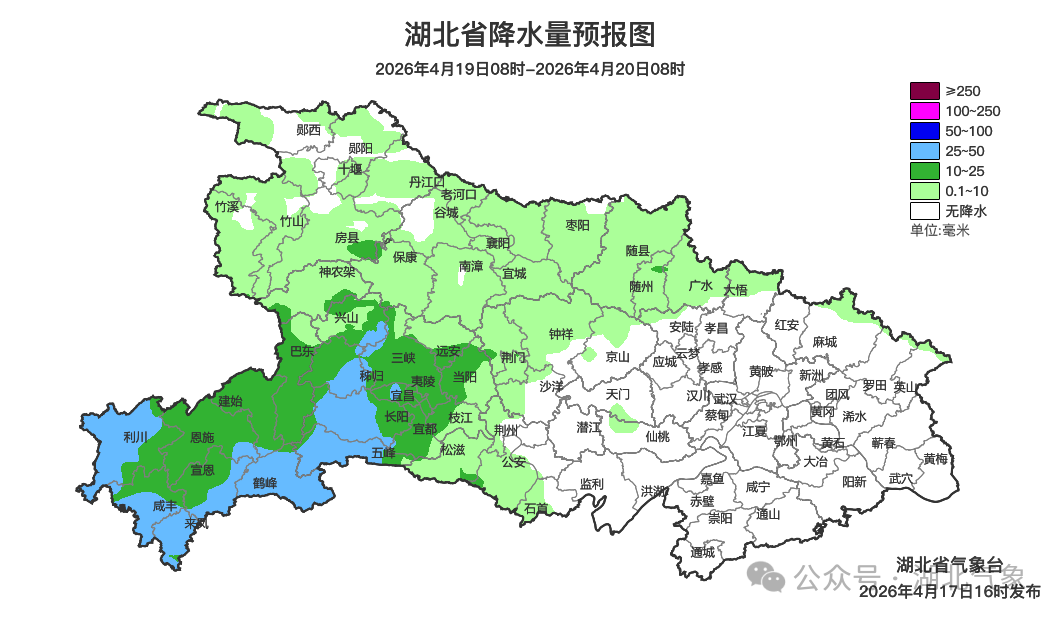 4月19日08时-20日08时,鄂西南多云转中到大雨;鄂西北、鄂东北西部、江汉平原多云转阵雨或雷阵雨;其他地区晴天到多云。省内中西部局地伴有冰雹、雷暴大风等强对流天气。最高气温28~31℃,最低气温15~19℃,偏东风2到3级转偏北风3到4级、阵风5到8级。