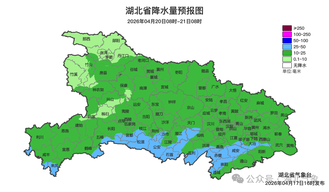 4月20日08时-21日08时,鄂西南南部、江汉平原南部、鄂东南阴天有中到大雨;其他地区阴天有小到中雨。最高气温西部15~19℃、中东部20~25℃,最低气温9~13℃,偏北风4到5级、阵风6到9级。