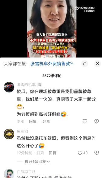 4月16日,张雪晒员工广交会采访视频,视频中的员工称已经有不少订单来自西班牙等欧洲国家,“为我们老板感到高兴”。