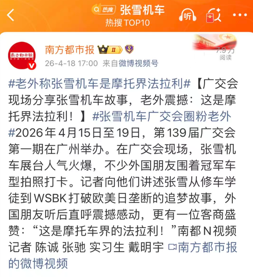(来源 中国青年报 广交会微新闻、南方都市报、新华社、@张雪的机车)