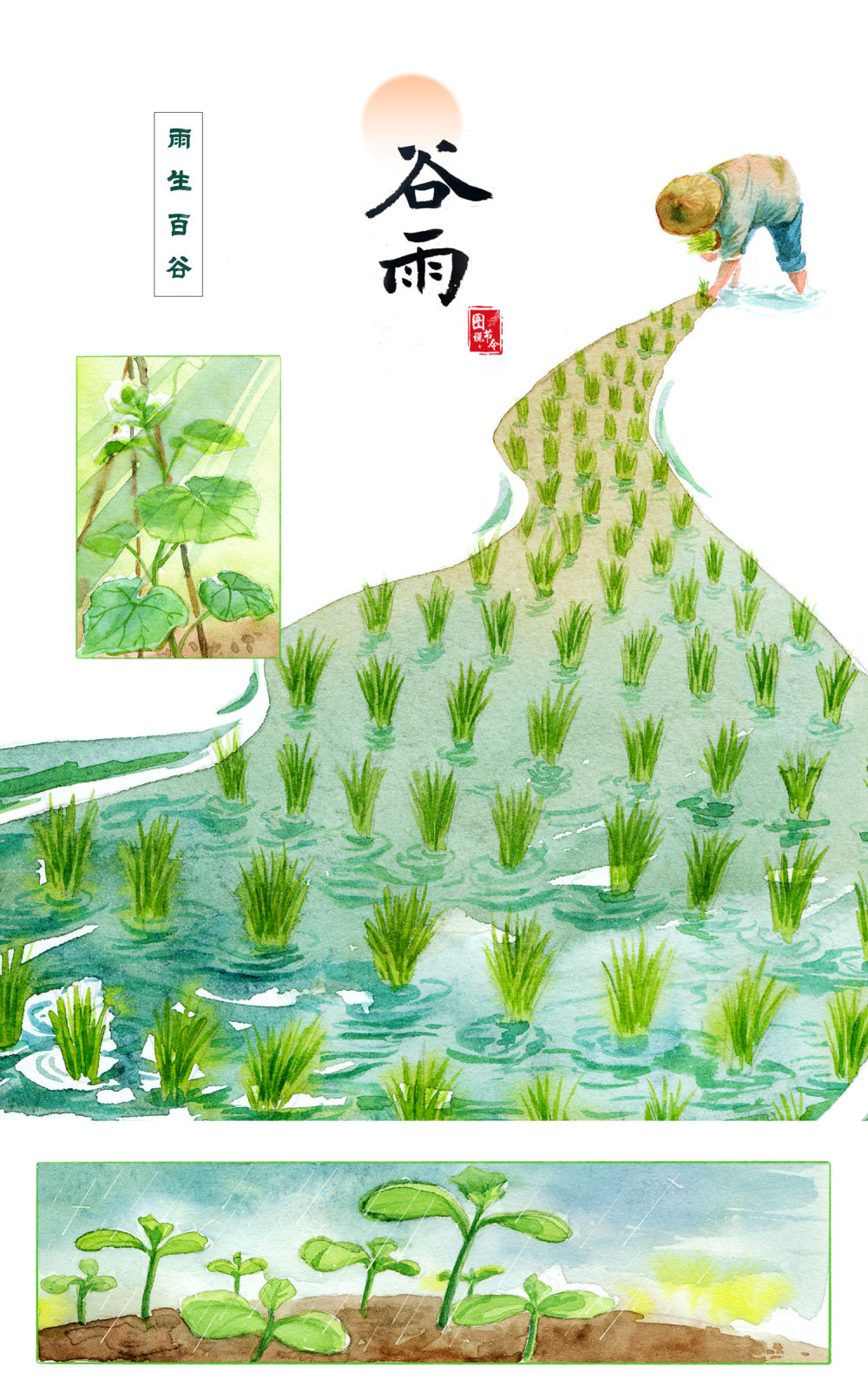 提到谷雨节气,《群芳谱》记载:“谷得雨而生也”。谷雨处于春夏交替之际,气温升高加快,光照充足,降雨量增加,这对农作物的种植和生长较为有利,但增多的降雨却会给人带来致病的湿气。