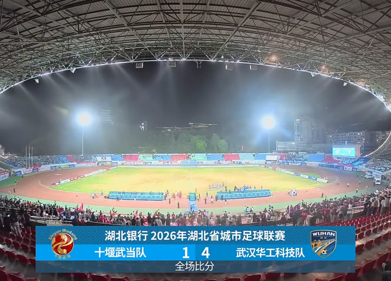 今晚(4月19日),2026湖北省城市足球联赛(“楚超”)第一轮焦点之战在十堰体育场打响,最终十堰武当队坐镇主场1-4武汉华工科技队。
