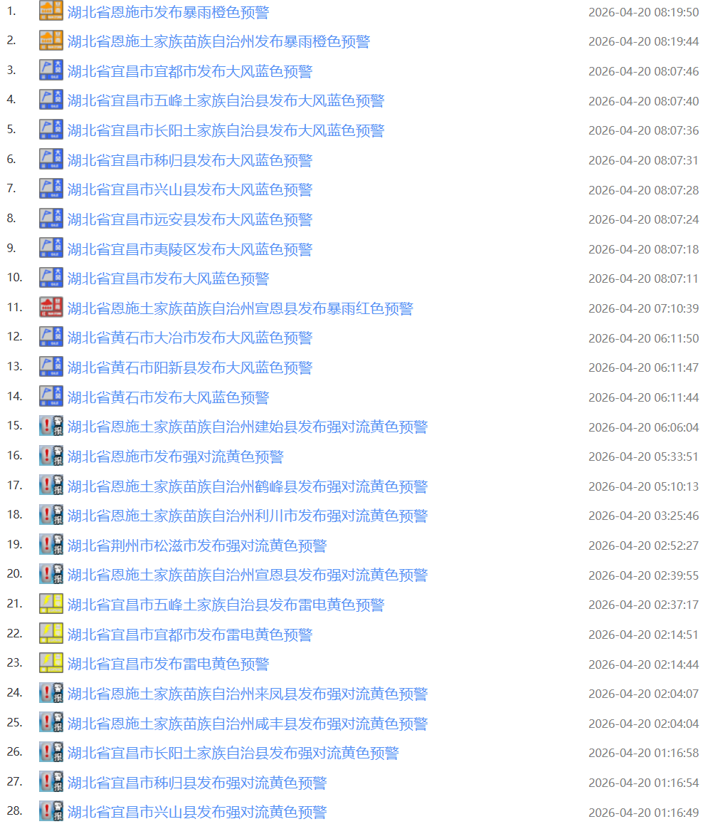 今日(4月20日)凌晨起,湖北宜昌、黄石等地发布大风预警,宜昌、恩施等地发布强对流预警,恩施发布暴雨预警。截至8点30分,湖北今日已经发布28条预警信息。