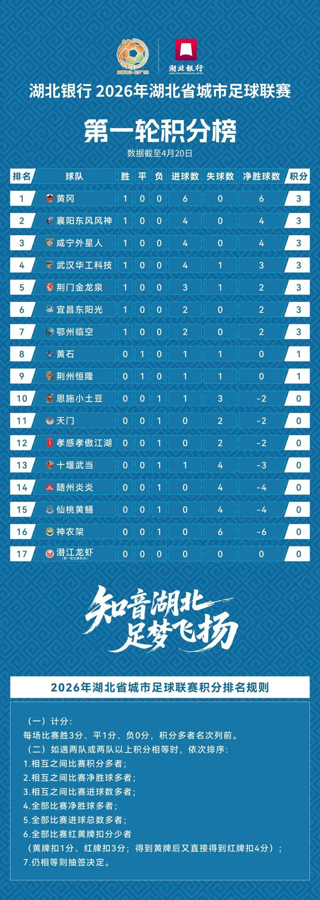 “楚超”第一轮积分榜。(来源:湖北省城市足球联赛)