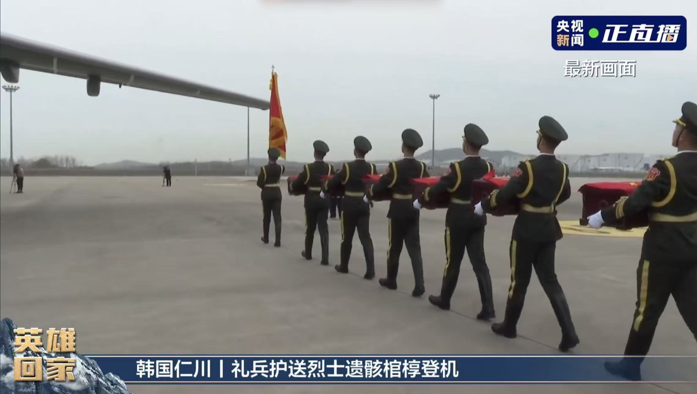 中韩双方代表现场签署交接书,中国人民解放军仪仗司礼大队礼兵持国旗护送烈士棺椁登上解放军空军“运-20B”运输机,烈士英灵将回到祖国和人民怀抱。