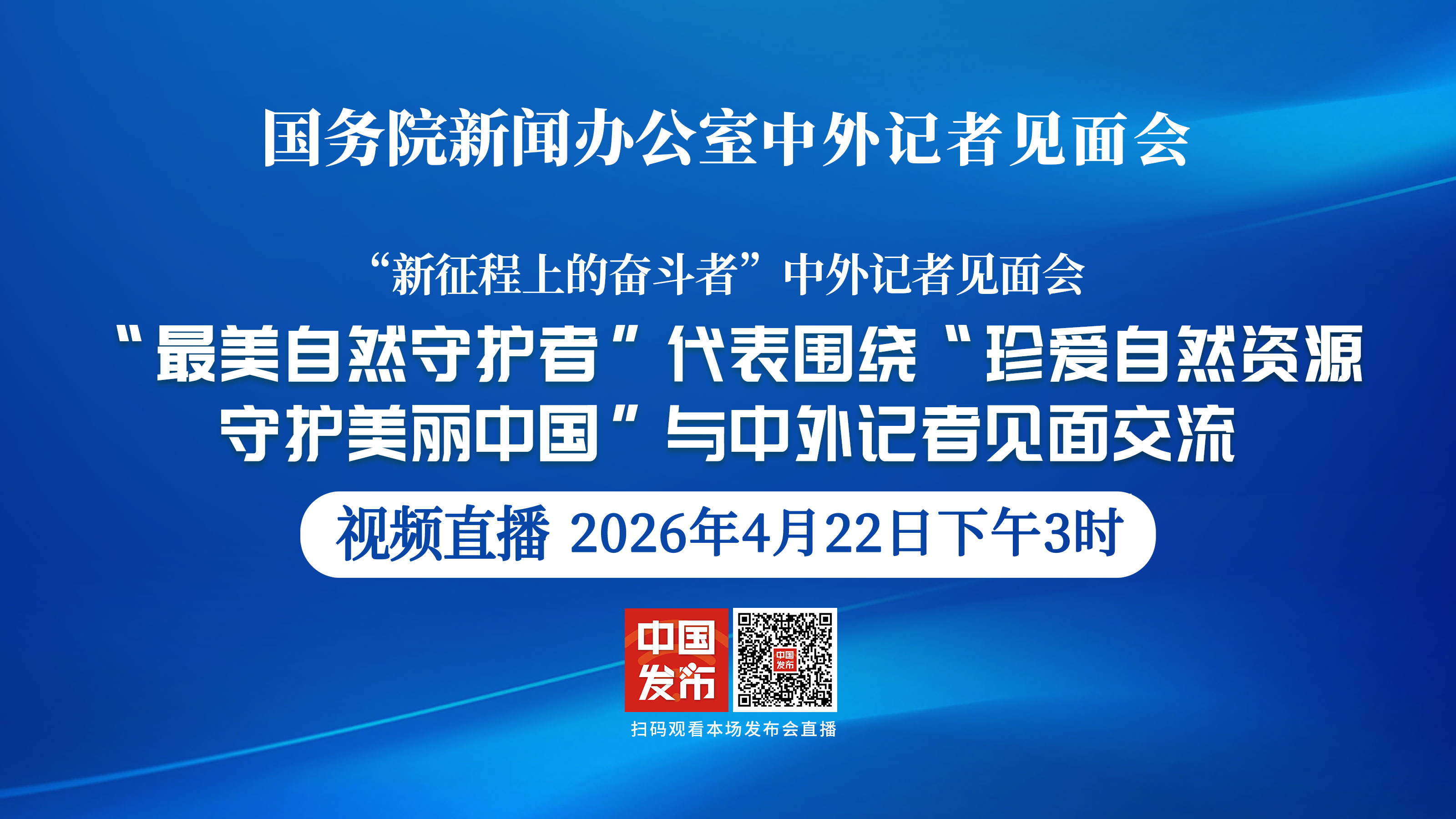国务院新闻办公室于2026年4月22日(星期三)下午3时举行“新征程上的奋斗者”中外记者见面会,请“最美自然守护者”代表围绕“珍爱自然资源,守护美丽中国”与中外记者见面交流。