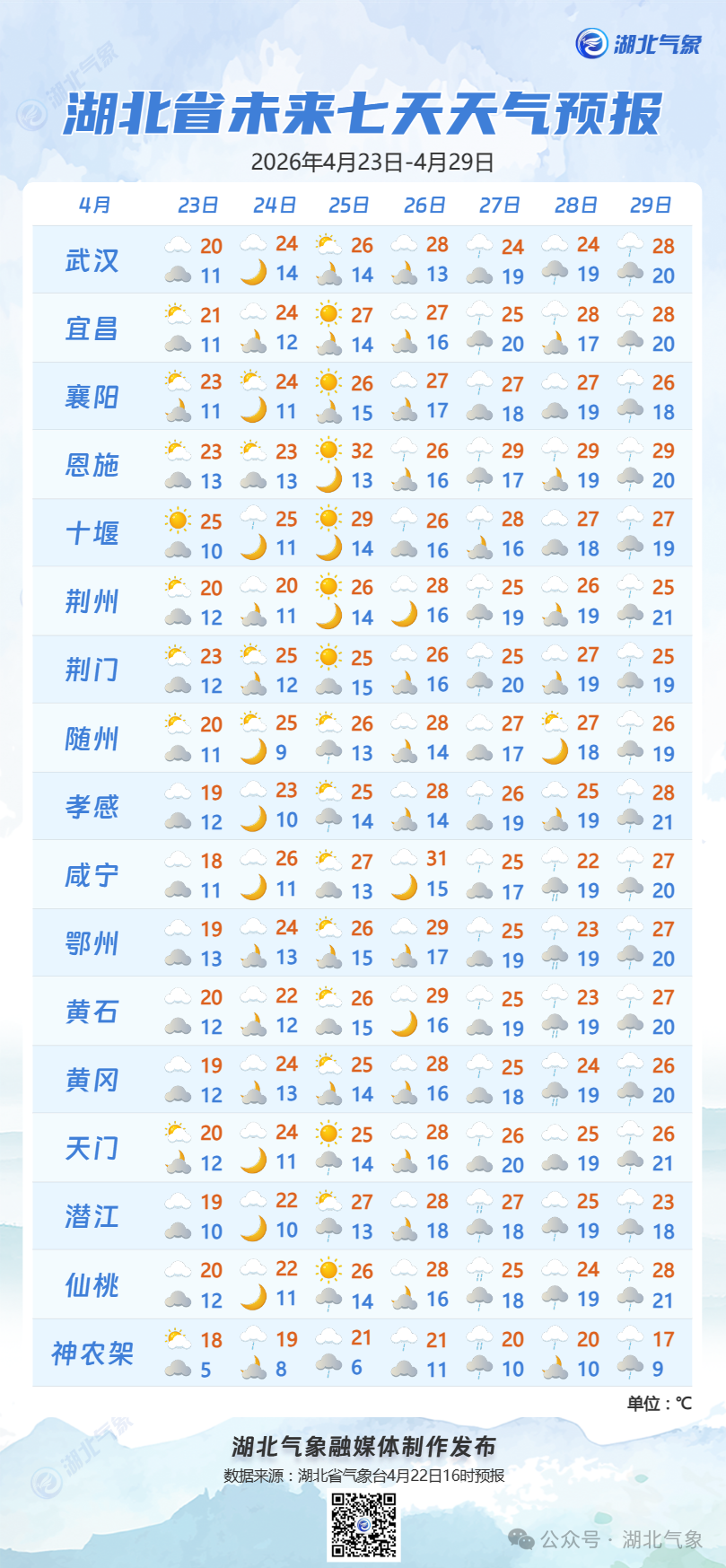 4月23日08时-24日08时,鄂东北东部、鄂东南北部阴天转多云,局地有零星小雨;其他地区多云到晴天。最高气温西部20~25℃、中东部18~22℃,最低气温9~12℃,偏北风转偏东风2到3级。