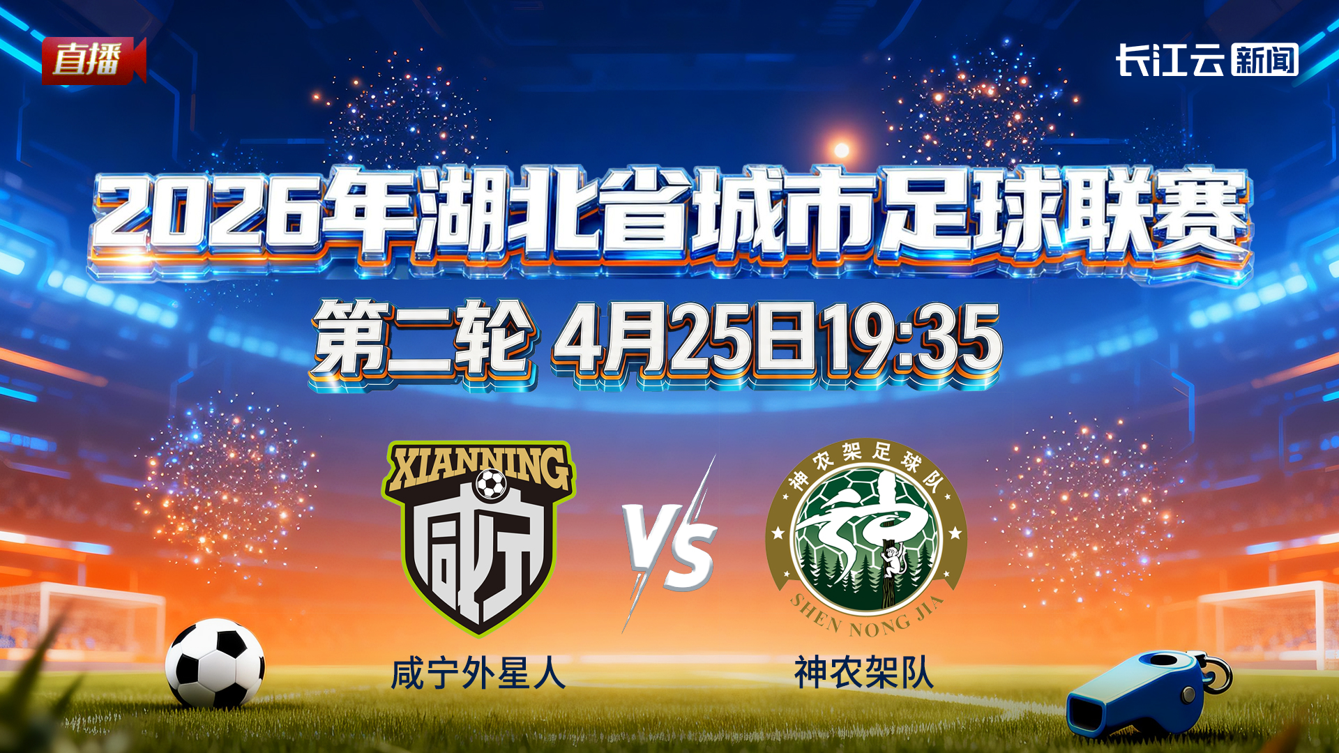 2026年湖北省城市足球联赛(“楚超”)第二轮——咸宁队主场迎战神农架队的比赛,将于4月25日19:35在咸宁崇阳县文体中心打响,长江云新闻将全程直播本场对决。