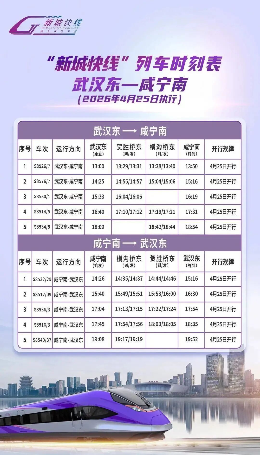 今天(4月25日)9时30分,武咸城际铁路“新城快线”首趟列车从武汉东站准点发出。45分钟后,抵达咸宁南站。