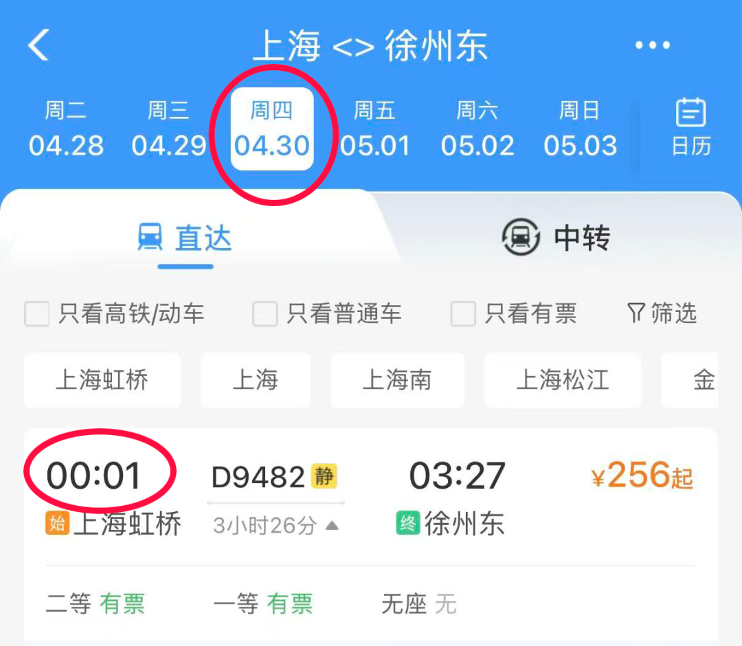 举个例子,从上海开往徐州的D9482次列车,发车时间为4月30日0时01分,旅客则需要在4月29日晚前往上海虹桥站候车。