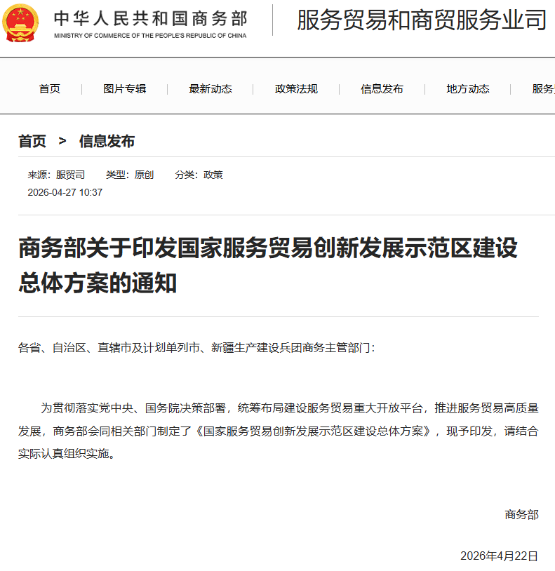 近日,商务部关于印发国家服务贸易创新发展示范区建设总体方案的通知,在北京、天津、上海、重庆、大连、厦门、青岛、深圳、南京、杭州、合肥、武汉、广州、成都、西安、苏州等16个城市和海南省率先开展示范区建设。