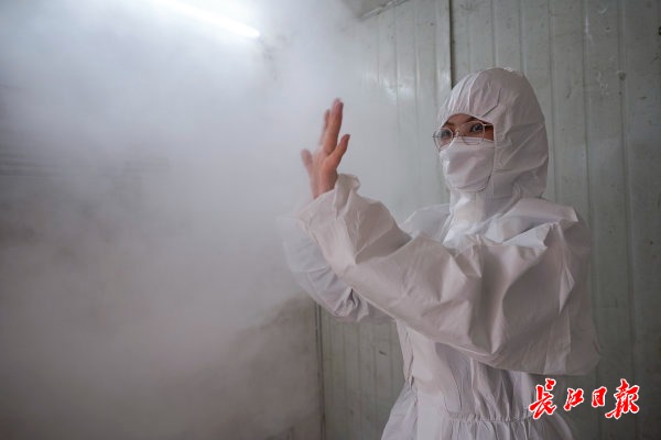 王巧娜在进入黄陂一家养殖场之前,进行物理消毒。
