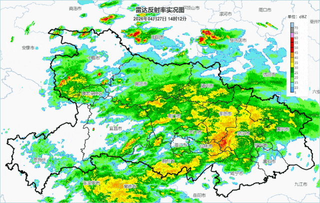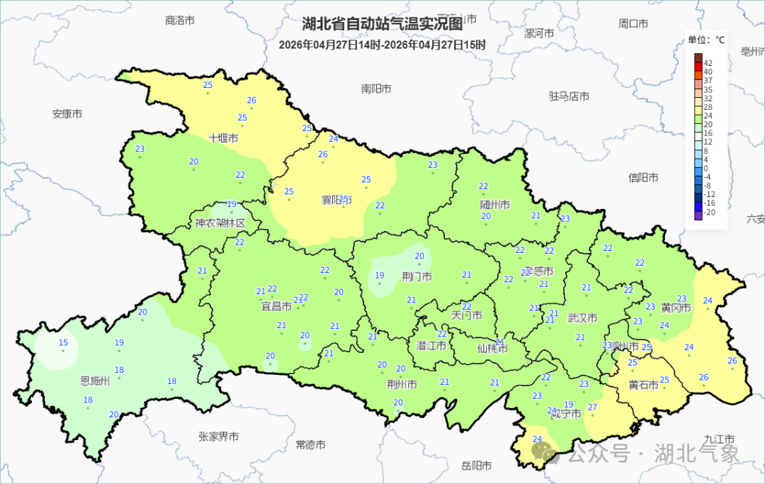 4月27日20时-28日08时,江汉平原南部、鄂东南阴天有中到大雨,局地暴雨;其他地区阴天有小到中雨,局地大雨。省内局地伴有雷电。最低气温14~19℃,偏北风3到4级、阵风5到6级。