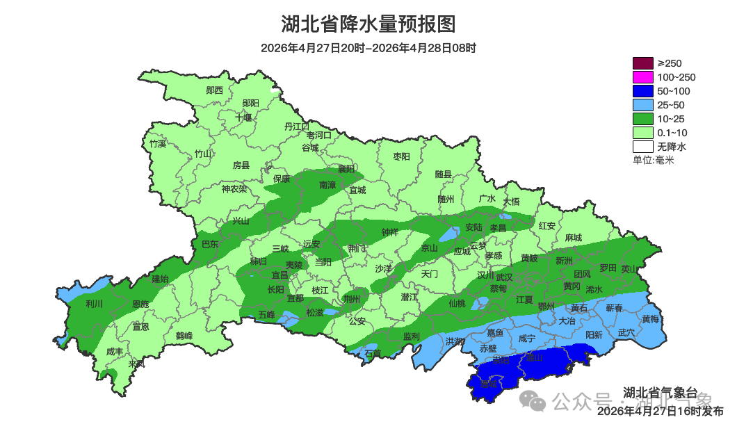 【温馨提示】今天夜间到明天,湖北南部部分地区雨势较强,伴有雷电大风等强对流天气,建议公众关注临近预报预警信息,警惕地质灾害、山洪、城乡积涝、农田渍涝等次生灾害。气温骤降,请及时增添衣物,谨防感冒。雨天路滑、能见度低,出行请注意交通安全。