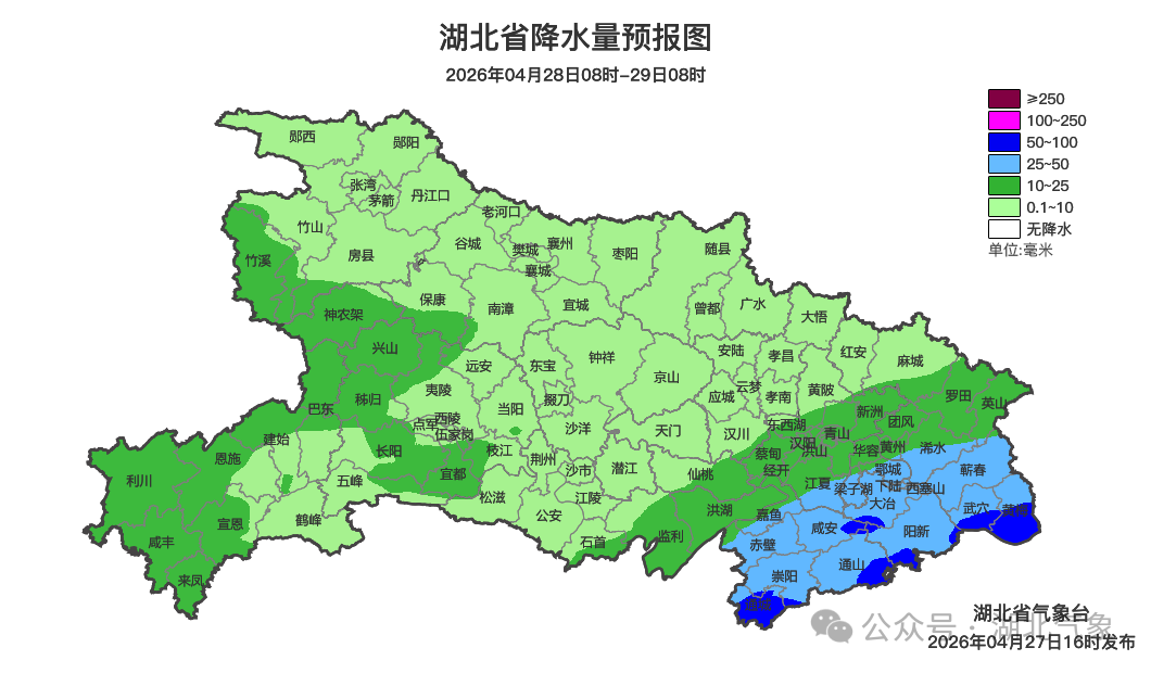 4月28日08时-29日08时,鄂东南阴天有中到大雨,局地暴雨;鄂西南阴天有小到中雨;其他地区小到中雨转多云。最高气温15~20℃,最低气温10~15℃,偏北风3到5级、阵风6到8级。