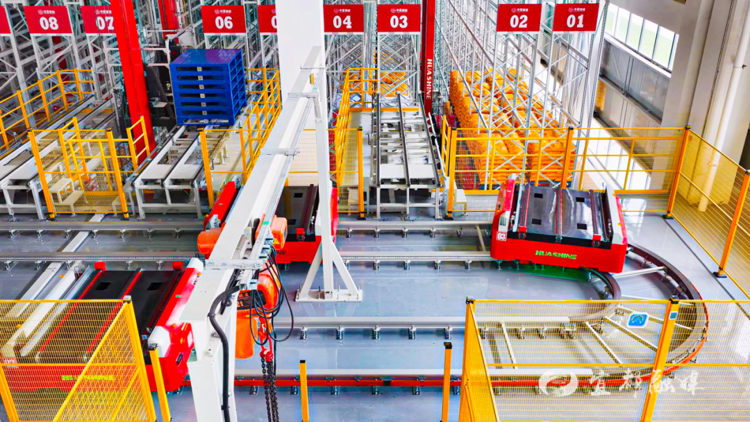 最令人震撼的是智能化立体仓库,21米高的仓库里,智能堆垛机、AGV智能小车等设备根据需求自由穿梭、不间断作业,彼此互不干扰,全程无需人工值守。
