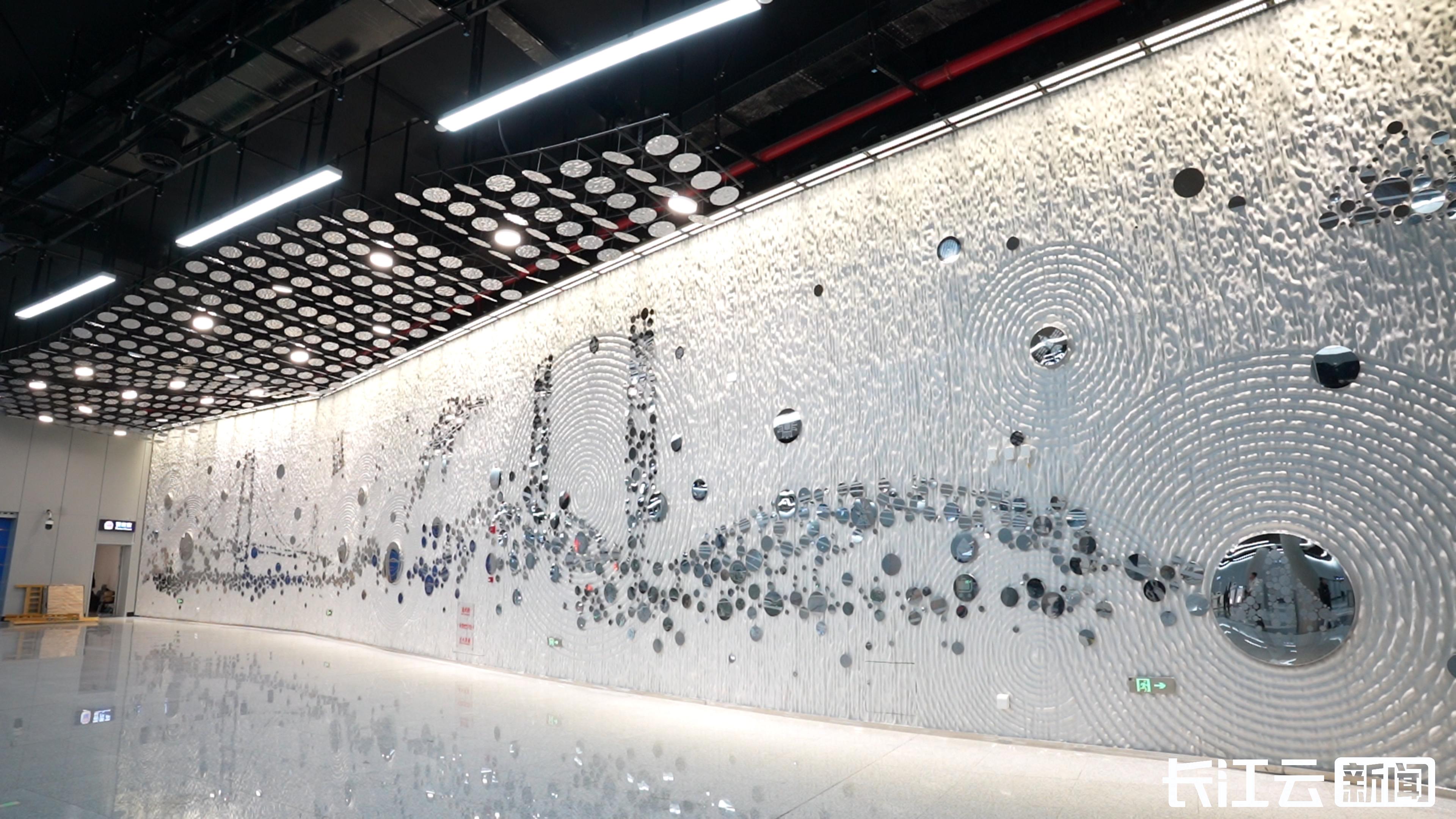该站的艺术品以“博览万象”为艺术设计主题,设计堪称“微型展览”。艺术品设计以“叙事+陈列”为核心,通过材质、造型与展陈方式的综合运用,以及墙面、吊顶与陈列三位一体的空间营造,集中展示了长江文化的自然禀赋、历史厚度与开放精神。作品以长江水文化为精神内核,艺术墙面采用镜面不锈钢锻造工艺,以波点塑形,通过材质的光影流转与形态的韵律起伏,抽象呈现长江水势的流动感与生命力。画面通过陈列“长江文化”和“一带一路”相关展品,将长江流域的文化积淀与开放交流的历史脉络相贯通,具象化国家博览功能,彰显包容互鉴的文化特质。艺术吊顶采用流线金属盘模拟水波,形成丝绸般波光粼粼的视觉效果,将自然水韵转化为丝绸意象,隐喻长江作为文化与商贸通道所承载的流动性与生机活力。