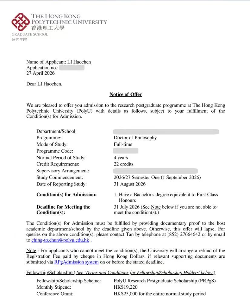 获100万港币奖学金!湖北一本科生直博香港理工大学