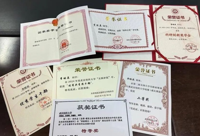 4月27日,武汉纺织大学资源与环境学院本科生李皓辰收到香港理工大学直博生录取通知书,并获得100万港币全额奖学金。李皓辰的导师、武汉纺织大学资源与环境学院副教授李强评价他:“这是个坚韧且细致、能够把科研的‘冷板凳’坐热的孩子。”