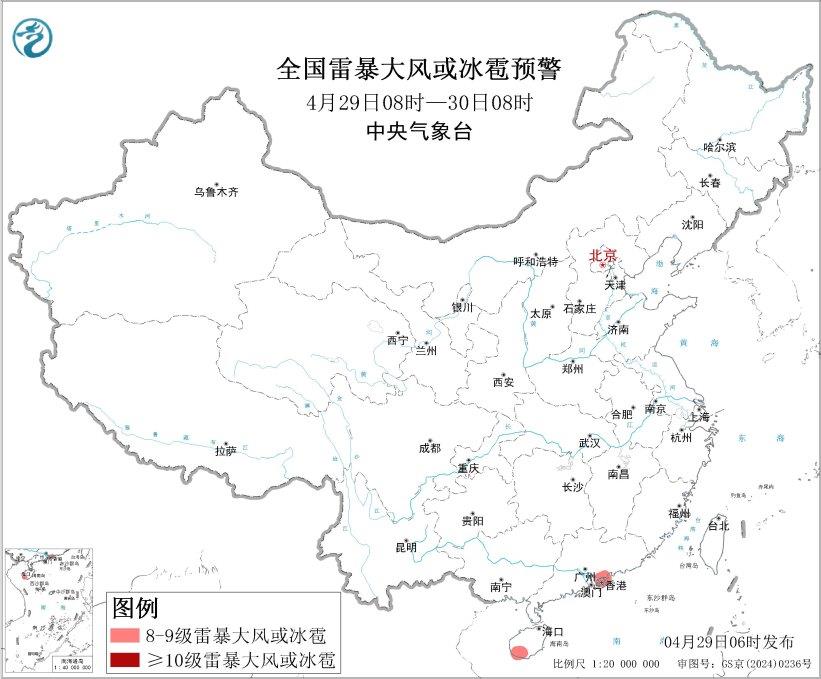 中央气象台4月29日6时继续发布强对流天气蓝色预警: