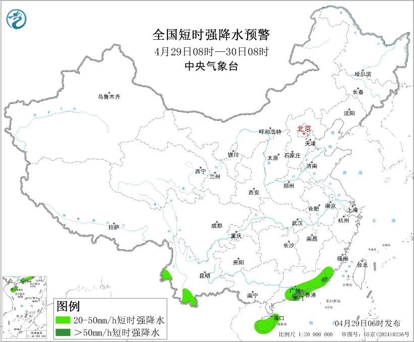 预计4月29日8时至30日8时,广东中南部、海南岛西南部等地的局地将有8级以上雷暴大风或冰雹天气;华南东南部、西南地区西南部等地的部分地区将有小时雨量大于20毫米的短时强降水天气,其中,广东中南部和西南部沿海等地的局地小时雨量大于50毫米,最大可达60毫米以上。