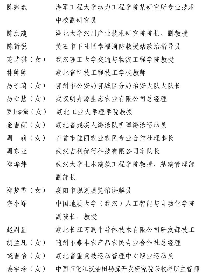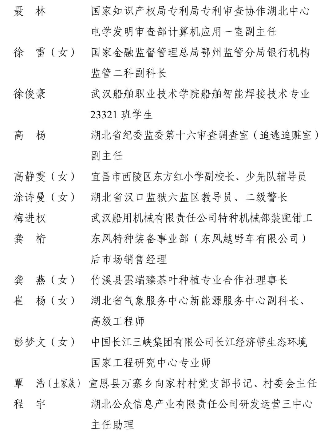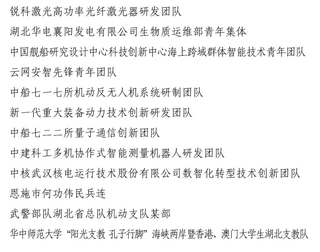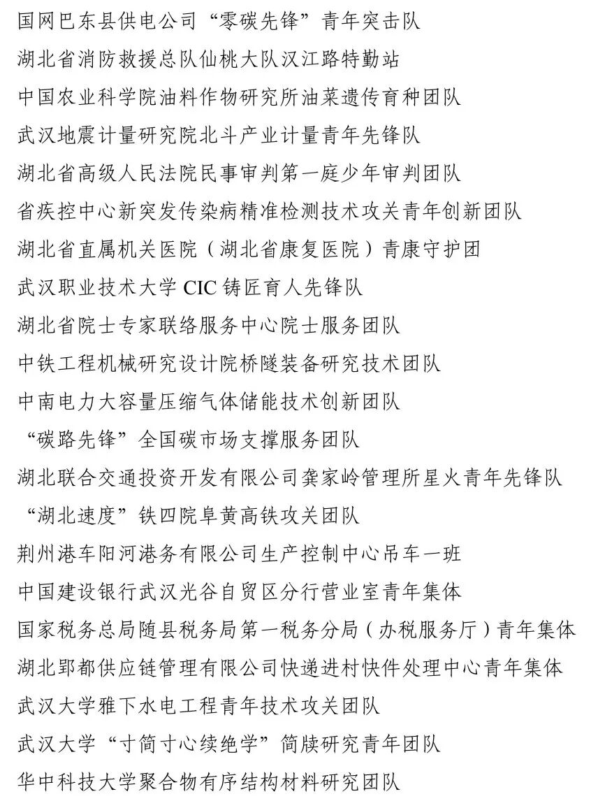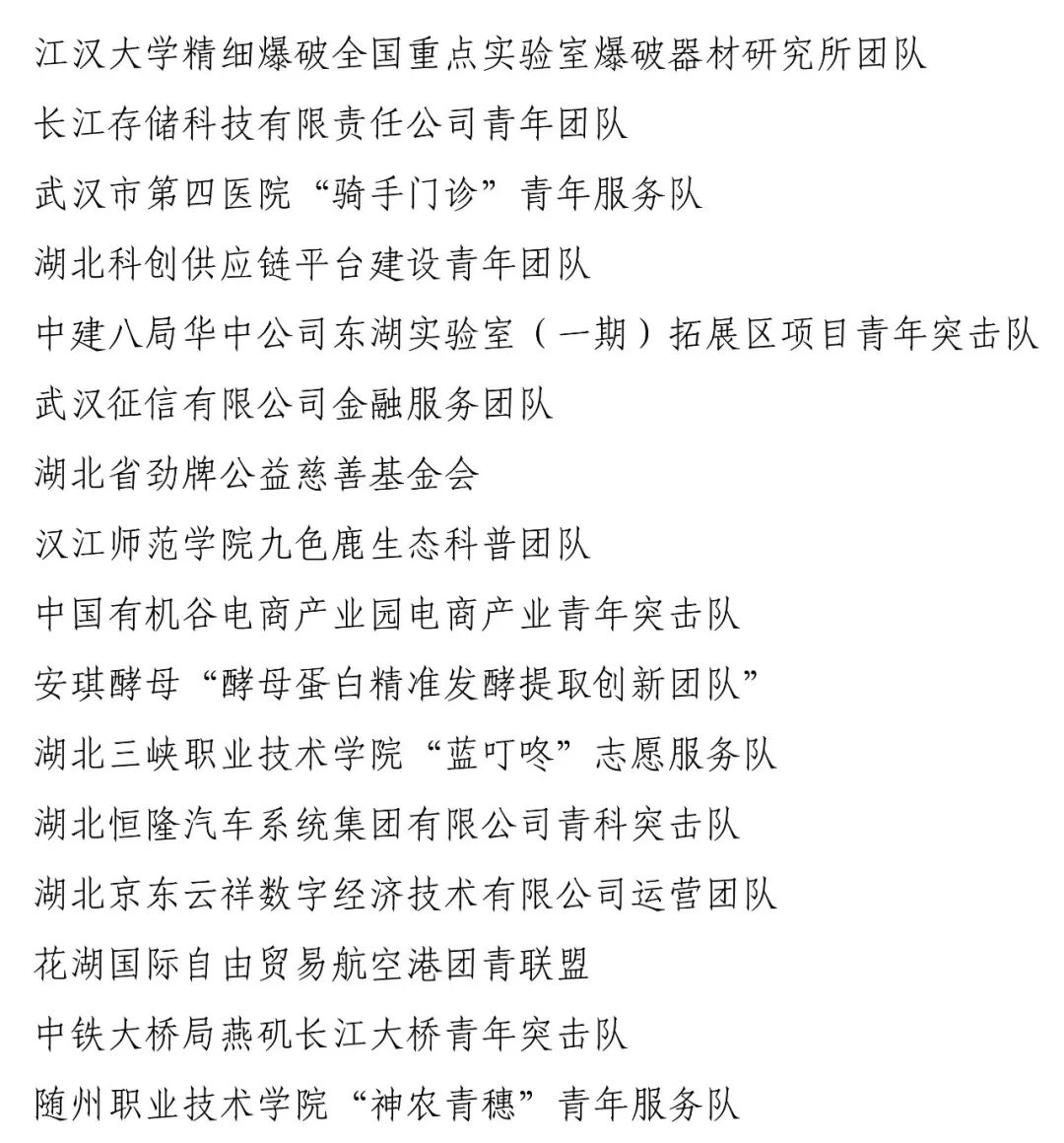 为表彰先进、树立榜样,充分发挥青年典型示范引领作用,激励全省广大青年向先进学习、向模范看齐,省人力资源和社会保障厅、共青团湖北省委、省青年联合会决定,授予江汉大学精细爆破全国重点实验室爆破器材研究所团队等70个集体“湖北青年五四奖章集体”,授予丁哲等100名同志“湖北青年五四奖章”。