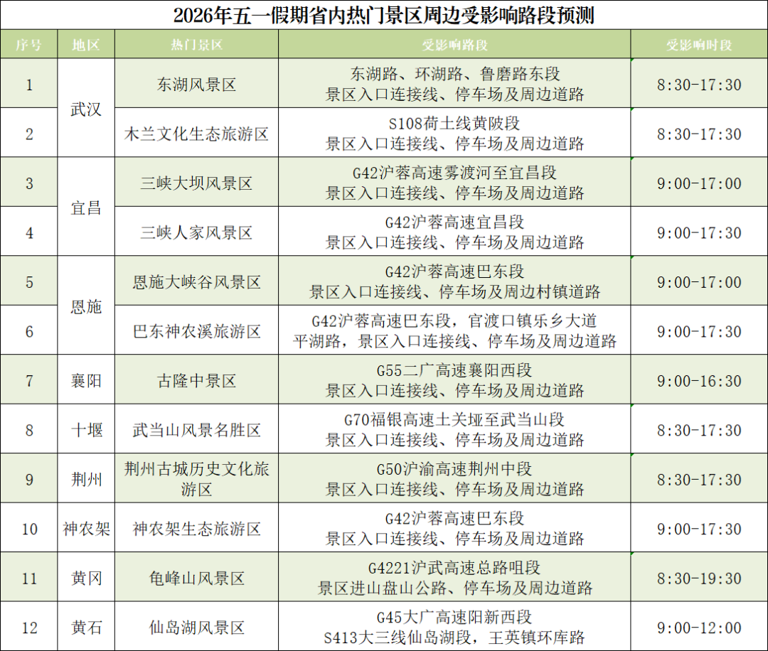 “五一”假期各地将举办多场次大型文娱活动,其中“楚超”将在武汉、黄石、鄂州、随州、孝感、荆门等地举行,将吸引大量球迷观赛,襄阳“2026盛世唐城沉浸式实景演出季(五一专场)”预计人流量达18万人次,“2026武汉都市花展”、“2026荆州楚文化节沉浸式国风盛典”将吸引超15万人次参加,“2026武汉仙人掌音乐节”“周深2026【深深的】巡回演唱会-武汉站”将吸引12万乐迷参加。届时,相关活动场所周边道路人流、车流短时聚集,路网超饱和运行,缓行概率高。
