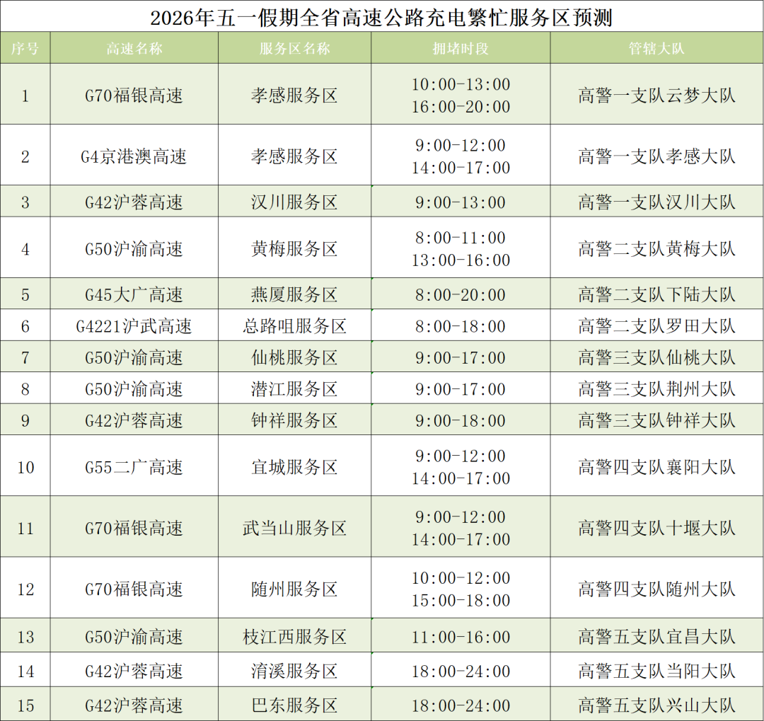 今年假期,沪渝、福银高速部分路段“四改八”改扩建施工仍在进行,单幅双向通行易导致区域路段通行压力集中。新通车的武天高速尚处磨合期,首次面对大流量考验,管理力量尚在适应,可能影响通行节奏。随着新能源车快速增长,假期高速新能源车占比预计创新高,高峰时段服务区充电排队车辆易倒灌主线,增加追尾风险。