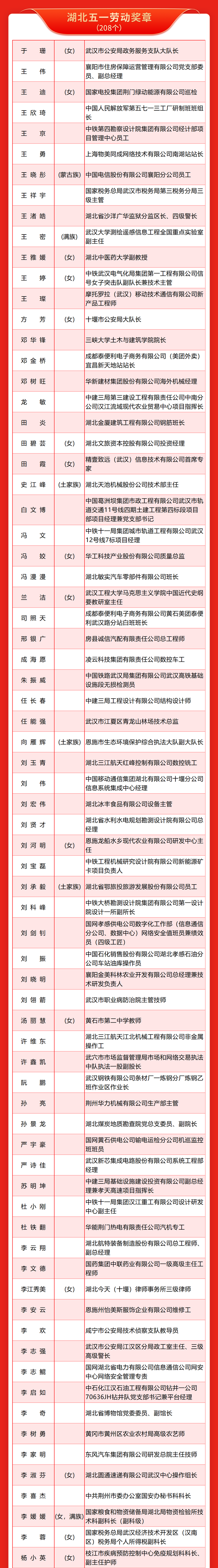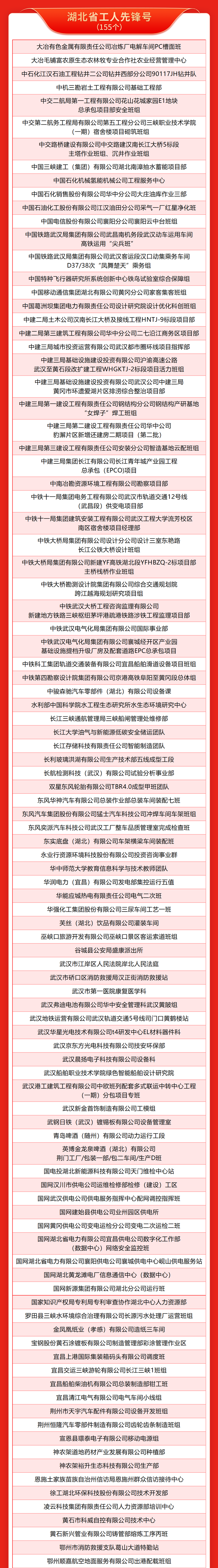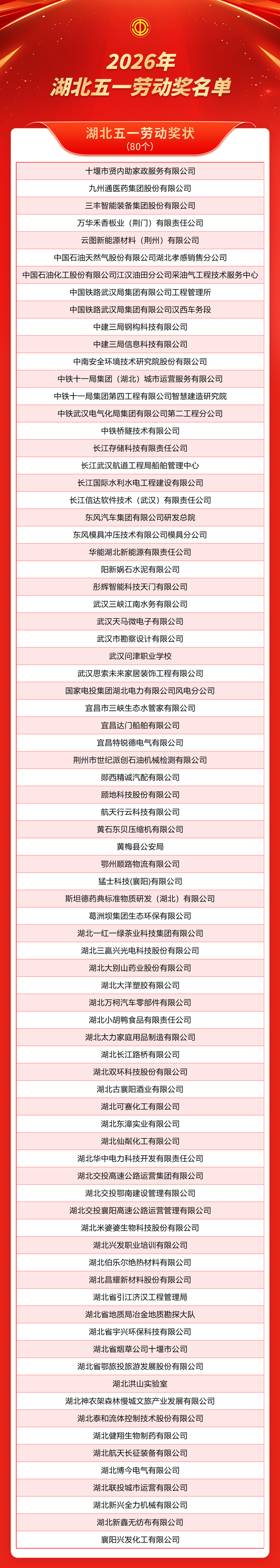 4月29日,2026年庆祝“五一”国际劳动节暨湖北五一劳动奖表彰座谈会在汉召开。会上宣读了《湖北省人力资源和社会保障厅、湖北省总工会关于表彰2026年湖北五一劳动奖和湖北省工人先锋号的决定》,十堰市贤内助家政服务有限公司等80个单位荣获“湖北五一劳动奖状”,于珊等208名个人荣获“湖北五一劳动奖章”,大冶有色金属有限责任公司冶炼厂电解车间PC槽面班等155个集体荣获“湖北省工人先锋号”。