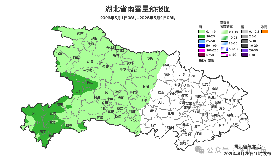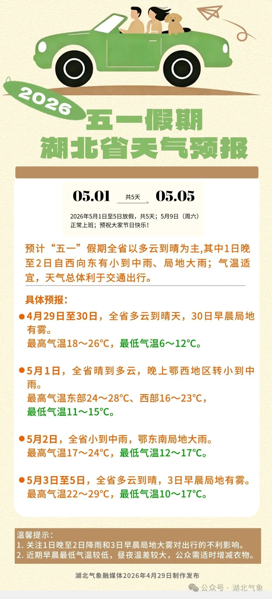 5月1日08时-5月2日08时,鄂西北、鄂西南、江汉平原西部多云转小到中雨;其他地区晴天转多云。最高气温西部18~22℃、中东部23~28℃,最低气温11~16℃,偏南风3到4级、阵风5到6级,夜间转偏北风2到3级。