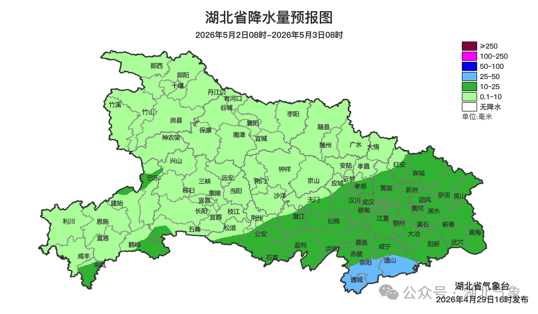 5月2日08时-5月3日08时,江汉平原东部、鄂东北东部、鄂东南阴天转小到中雨,其中鄂东南局地大雨;鄂西北小雨转多云;其他地区小到中雨转阴天。最高气温中西部17~21℃、东部21~24℃,最低气温西部11~15℃、中东部15~18℃,偏北风3级、阵风4到6级。