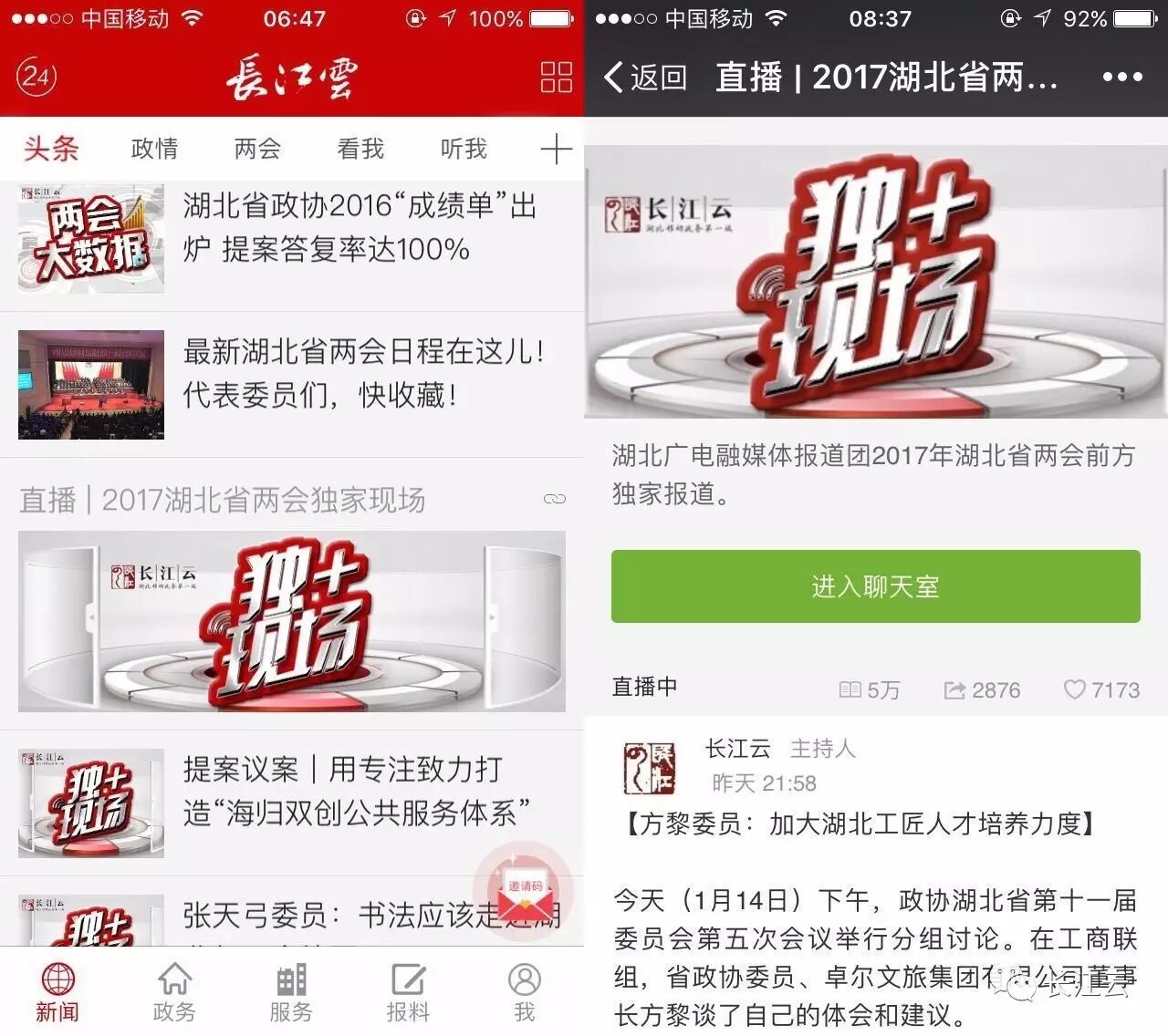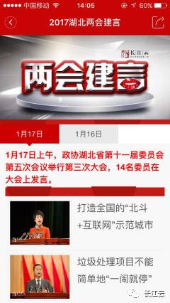 1月15日上午,在2017年湖北省政府工作报告发布期间,湖北广电长江云移动客户端同步弹窗推送10条信息,累计点击量过68万,超过全省新闻类客户端,位居第一。