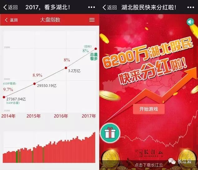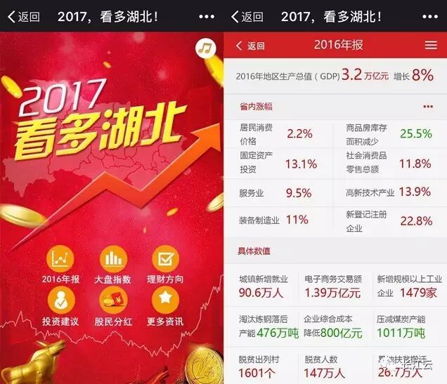 H5产品《2017,看多湖北!》,借鉴上市公司财报和股评元素,把湖北比作一家上市公司,把政府工作报告变成公司财务报告,将6200万湖北人比喻成“股东”,以自然嵌入的“答题抢红包”游戏邀请股东“分享湖北发展的红利”,营造湖北发展的超强气场。这款产品创意独特,形式新颖,趣味性、参与性极强,上线后即引起现象级转发。