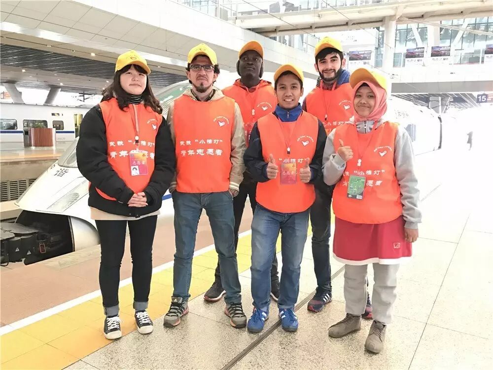 武汉站,数百名“小橘灯”志愿者奔走于汹涌的人潮中,为需要帮助的乘客提供服务。来自韩国、斯里兰卡、津巴布韦等15个国家和地区的留学生组成了这支特殊的小分队,他们在高铁前合影留念,用这种仪式记录中国的春节。