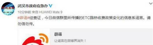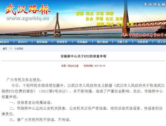 当晚23点,武汉市路桥中心的官方网站也发布了关于取消ETC收费谣言的郑重声明:该信息言论纯属造谣,该部门己向公安机关报案,公安机关正在严密追查,将依法追究造谣者、传谣者的法律责任。请广大市民网民不信谣,不传谣。