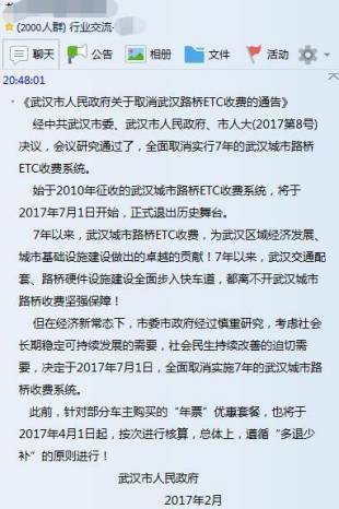 昨晚(2月16日),一份《武汉市人民政府关于取消武汉路桥ETC收费的通告》快刷爆了微信群、朋友圈以及QQ群,内容如下:
