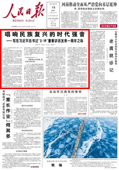 今天(2月19日),《人民日报》头版头条刊发《唱响民族复兴的时代强音》一文,纪念习近平总书记“2·19”重要讲话发表一周年。文章通过一个个案例和数据,讲述了在媒体格局深刻变化的过去一年,全国主流媒体牢记48字职责使命,锐意改进创新,在新闻舆论宣传、媒体融合发展、拓展对外传播等方面呈现出崭新气象,迸发出强大活力。
