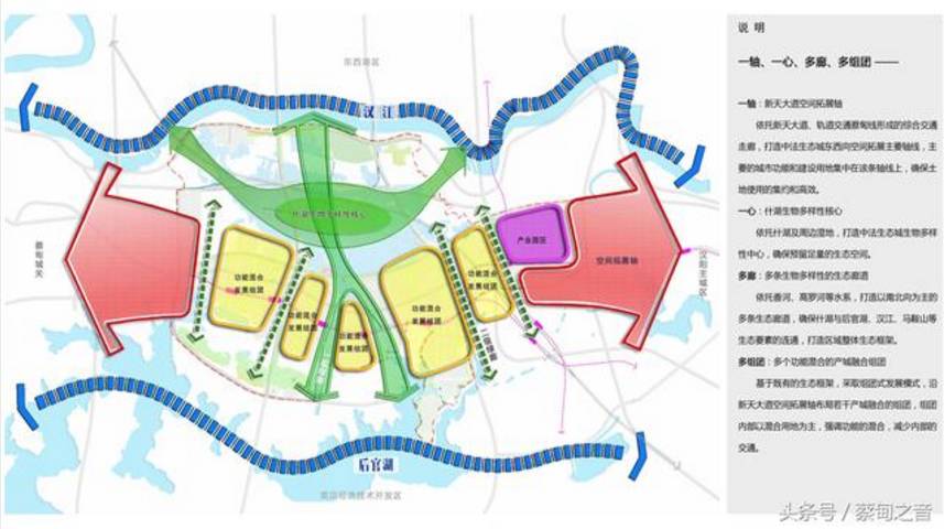 全域规划,产城融合,生态新城,城城对接,突出生态环保示范和产业创新,瞄准国际领先、世界一流目标,构建“一轴一心多廊多组团”城市发展架构,着力践行五大发展理念打造城市可持续发展标杆。
