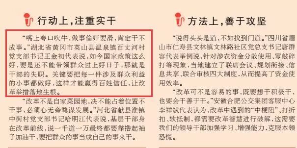 在《亲力亲为抓改革 扑下身子抓落实》一文,摘录了湖北省黄冈市英山县温泉镇百丈河村党支部书记王金初代表关于实干的说法。