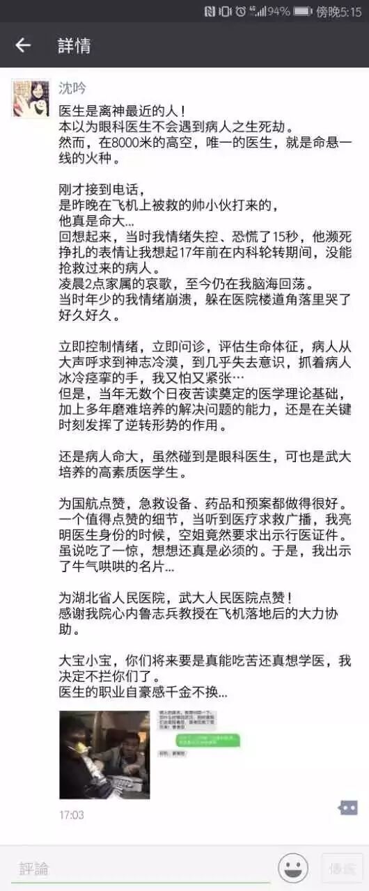 2017年2月23日晚,从武汉飞往广州的航班上,湖北小伙突发心脏病,生命危在旦夕。紧急时刻,武汉大学人民医院的女教授沈吟挺身而出,冷静施救,最终小伙成功获救。