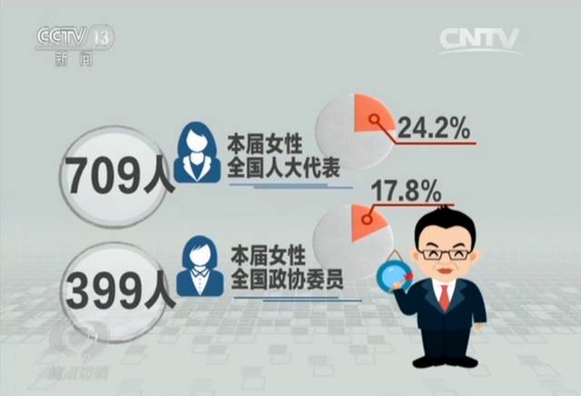 本届全国人大女性代表共709人,占全体代表的24.2%,是历届人大代表中女性比重最高的一届。本届全国女性政协委员399人,占委员总数的17.8%。